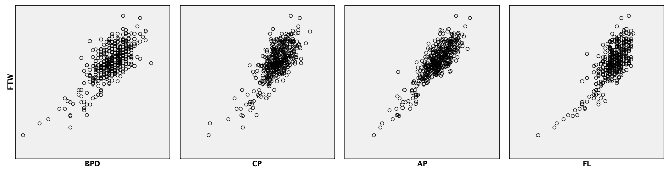 Ker bomo dodajali tudi člene višjega reda v regresijski model, najprej narišemo grafe raztrosa spremenljivk BPD, CP, AP in FL s spremenljivko FTW, da ugotovimo, ali obstajajo tudi kakšne nelinearne povezave med opazovanimi spremenljivkami in spremenljivko FTW.