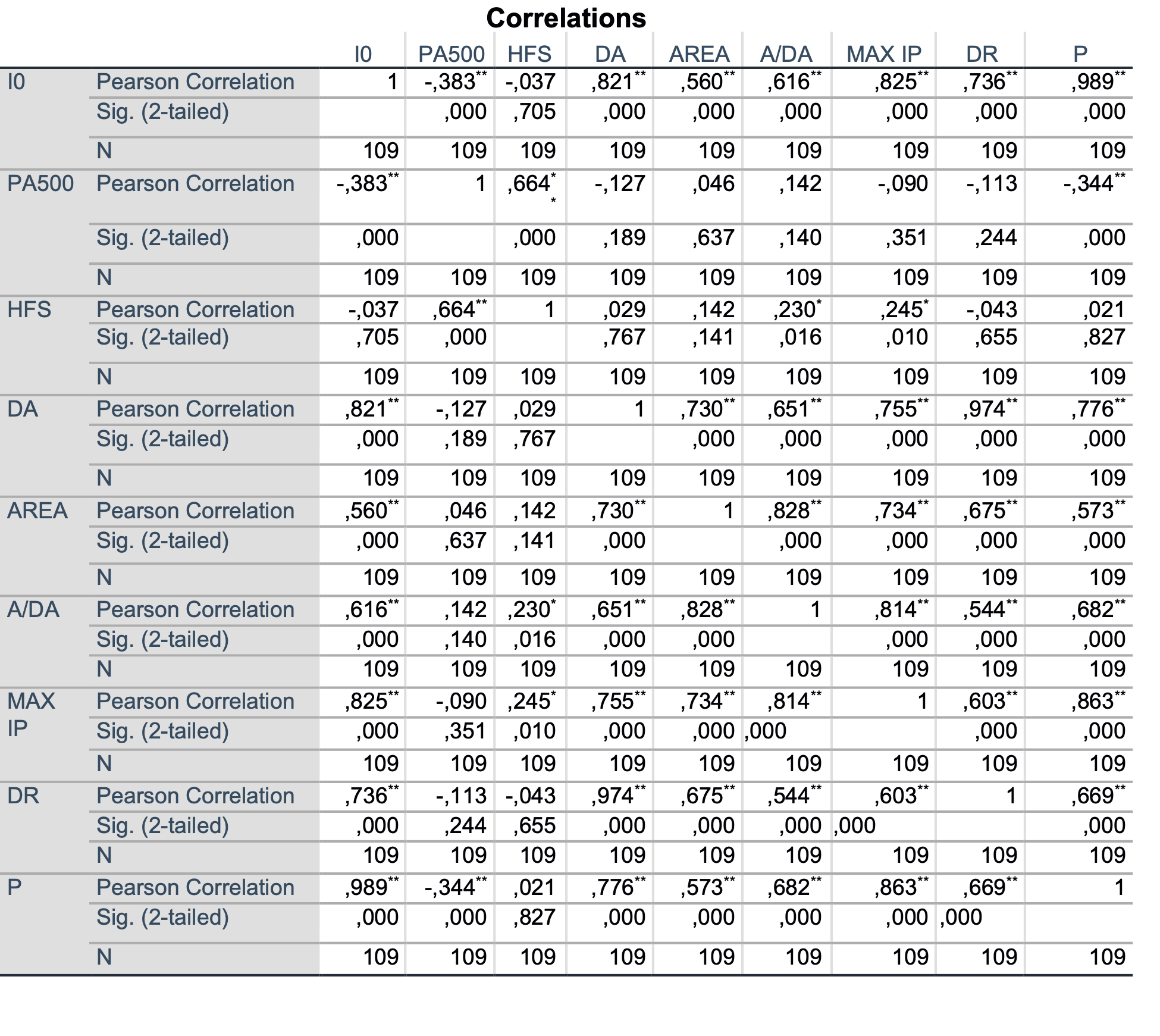 Po Pearsonovem koeficientu korelacije spremenljivka I0 dobro korelira z naslednjimi spremenljivkami: DA, MAX IP in DR (vrednost približno 0.75 ali več). Spremenljivka PA500 je najbolj korelirana s spremenljivko HFS (0.664). Vse omenjene korelacije so statistično značilne.
