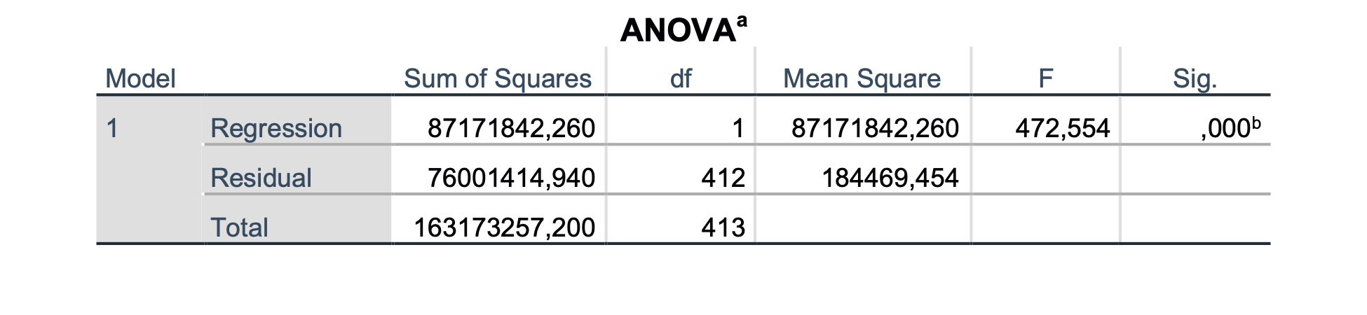 Tabela Model Summary nam pove, kakšen je determinacijski koeficient (R2) regresijskega modela. Tabela ANOVA nam pove, ali je regresijski model statistično značilen (p-vrednost regresijskega modela). V tabeli Coefficients so izračunani koeficienti β in pripadajoče p-vrednosti za posamezno spremenljivko.