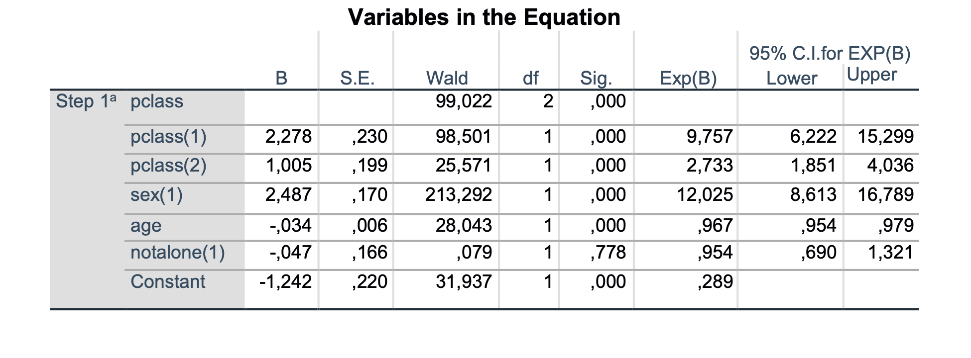 Zanimajo nas predznak regresijskih koeficientov (B), statistična značilnost in Exp(B). Če je vrednost regresijskih koeficientov pozitivna pomeni, da se razmerje obetov za preživetje povečuje, če pa je negativna pa se razmerje obetov preživetja zmanjšuje. Statistična značilnost nam pove ali je regresijski koeficient od nič statistično značilno različen. Ugotovimo, da so statistično ustrezni parametri pclass, sex in age, parameter notalone pa ni statistično značilno od nič različen (p = 0.778), kar pomeni, da to, ali je nekdo potoval sam ali ne, ni statistično pomemben dejavnik za preživetje. Vrednosti Exp(B) predstavljajo razmerja obetov za preživetje za posamezne regresijske spremenljivke. Na podlagi vrednosti v tabeli ugotovimo naslednje: