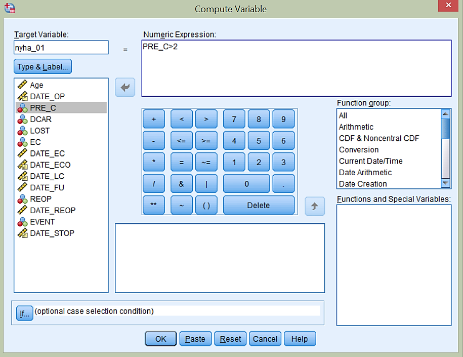 Recimo, da so resne težave po lestvici NYHA pri 3. in 4. stopnji, pri stopnjah NYHA < 3 pa manj resne težave. Tako bomo paciente v našem primeru ločili na dve skupini pacientov glede na spremenljivko PRE_C. Če je PRE_C > 2, je skupina z resnimi težavami, sicer pa z manj resnimi težavami. Zato bomo ustvarili bomo novo spremenljivko, ki bo imela vrednost 1 v primeru PRE_C > 2 in 0 sicer.