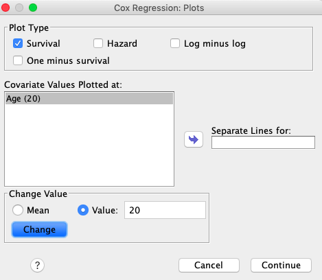 Ker nas zanimajo še krivulje preživetja pacientov pri starosti 20 in 60 let, to lahko narišemo tako, da ponovimo postopek modeliranja s Coxovo regresijo iz prej predstavljenih postopkov in pri grafih z gumbom Plots… izberemo izris krivulje pri vrednosti 20 ali pri vrednosti 60, kot je prikazano v nadaljevanju. Izris grafov moramo izvesti vsakič ločeno.