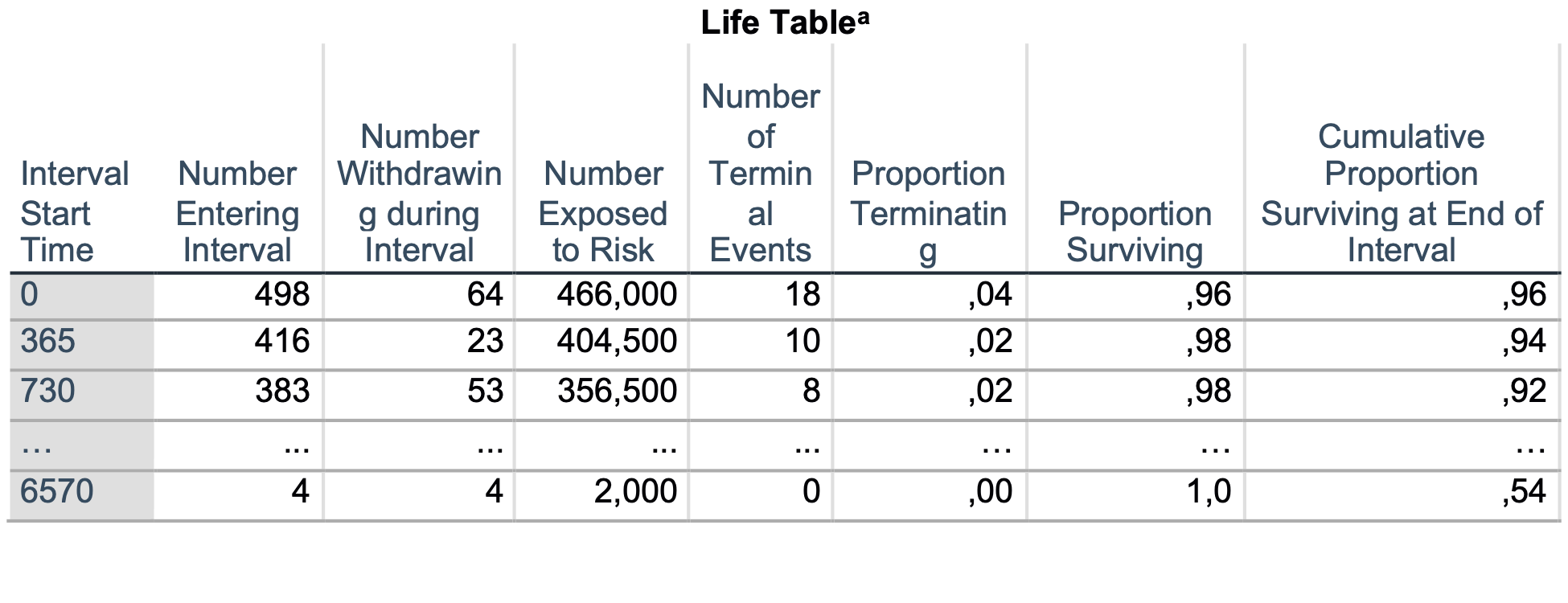 Interval Start Time pove časovni interval. Number Entering Interval pove, koliko ljudi je vstopilo v analizo v tem intervalu. Number Withdrawing during Interval pove, koliko oseb je v tem času zapustilo analizo (cenzurirani podatki). Number Exposed to Risk so vse osebe, ki so vstopile v analizo v tem intervalu, od katerih odštejemo polovico oseb, ki so zapustili analizo. Number of Terminal Events pa pove, koliko dogodkov se je zgodilo v nekem intervalu. Proportion Terminating izračuna delež dogodka v tem intervalu. Delež, da se dogodek ni zgodil je predstavljen v stolpcu Proportion Surviving. Cumulative Proportion Surviving at End of interval pove, kakšna je verjetnost preživetja po določenem času.